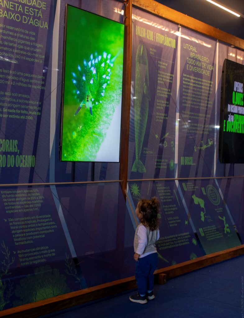 Por meio de painéis informativos, vídeos sobre biodiversidade, oceano profundo, lixo no mar e ciência e tecnologia os visitantes aprendem brincando. A exposição proporciona atividades lúdicas e interativas como óculos de realidade virtual que permite aos visitantes dar um mergulho na Baía de Guanabara no rastro de uma arraia; tocar réplicas de fitoplâncton impressas em 3D, em tamanho aumentado, tendo a oportunidade de pegar um ser marinho visto em sua maioria apenas através de microscópio.