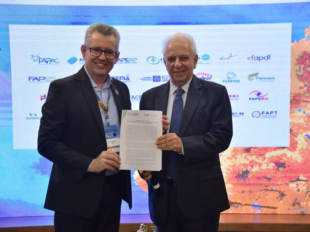 É firmada a primeira parceria institucional do INPO. Odir Dellagostin, presidente do Confap, e Segen Estefen, diretor-geral do INPO, assinam memorando de entendimento para ampliar a base de conhecimento científico e apoiar o uso sustentável do oceano.