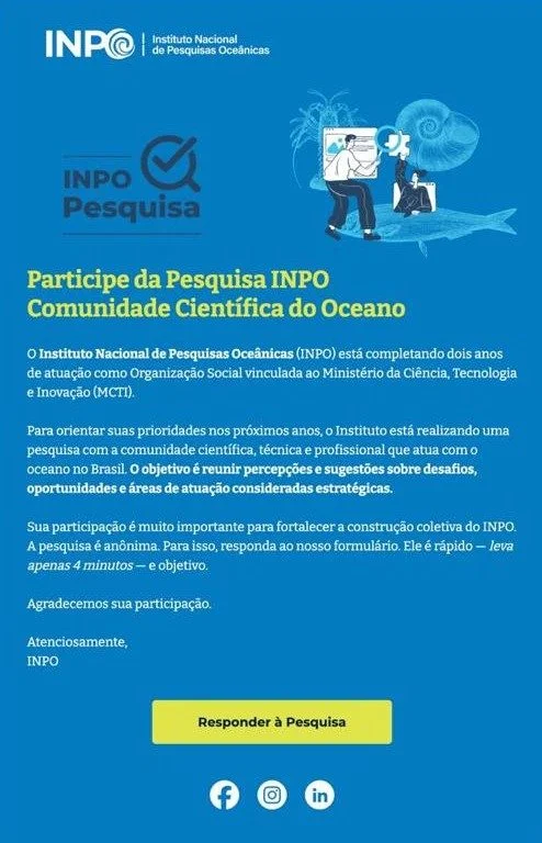 O INPO realiza pesquisa nacional para compreender as expectativas, desafios e oportunidades percebidos pela comunidade científica oceânica brasileira.