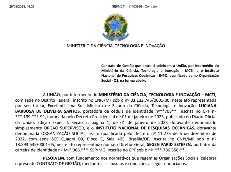 O Instituto Nacional de Pesquisas Oceânicas (INPO) é oficialmente criado com a assinatura do contrato de gestão com o Ministério da Ciência, Tecnologia e Inovação (MCTI), marcando o início de uma nova instituição dedicada à promoção integrada e transdisciplinar das ciências do mar no Brasil. A formalização como organização social permite ao INPO impulsionar pesquisas oceânicas estratégicas, fortalecer capacidades científicas e tecnológicas e apoiar políticas públicas voltadas à sustentabilidade e ao desenvolvimento nacional.